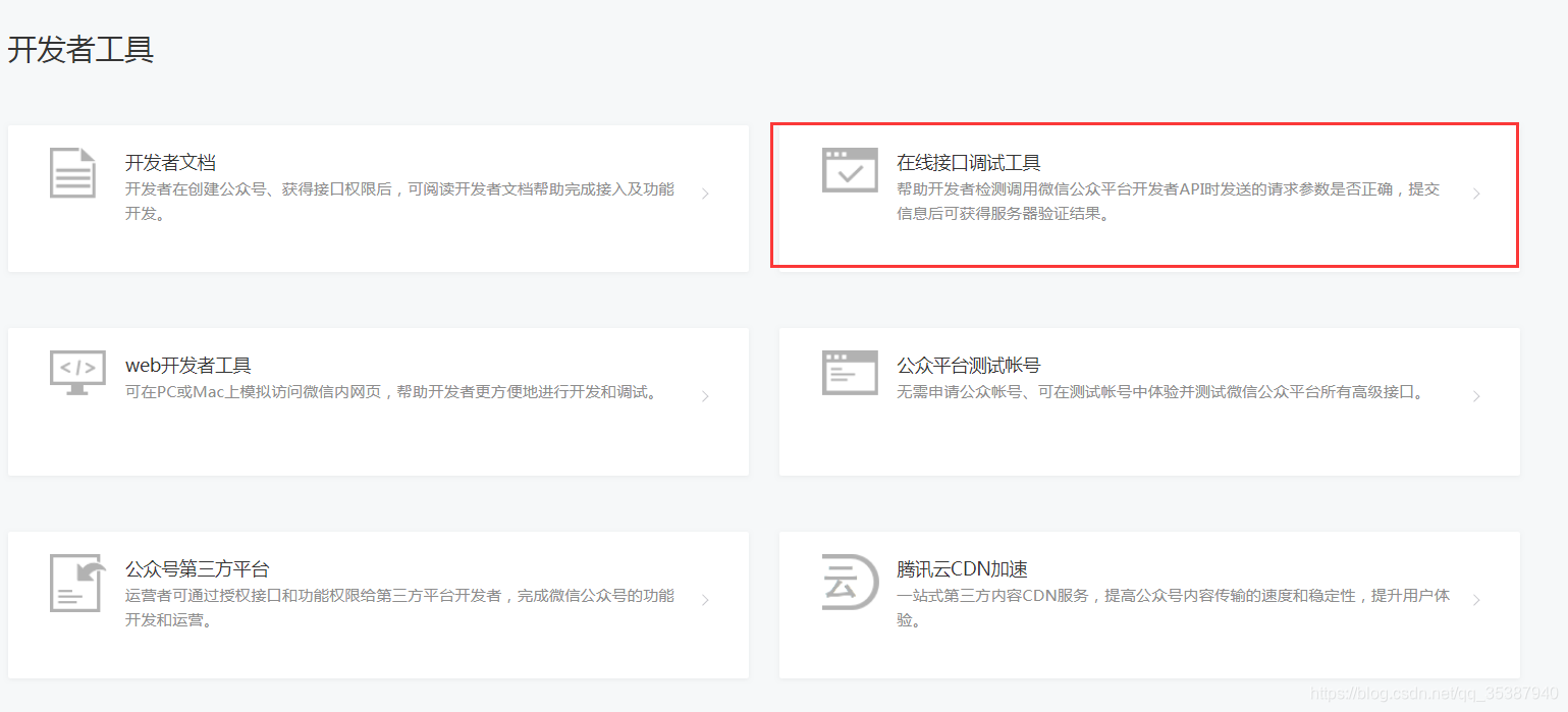 申请完成后, 登录,点击页面左侧的开发-开发者工具:(我们来申请一个微信公众平台测试帐号,因为我们绝大多数人没有已认证的微信公众号可以用)