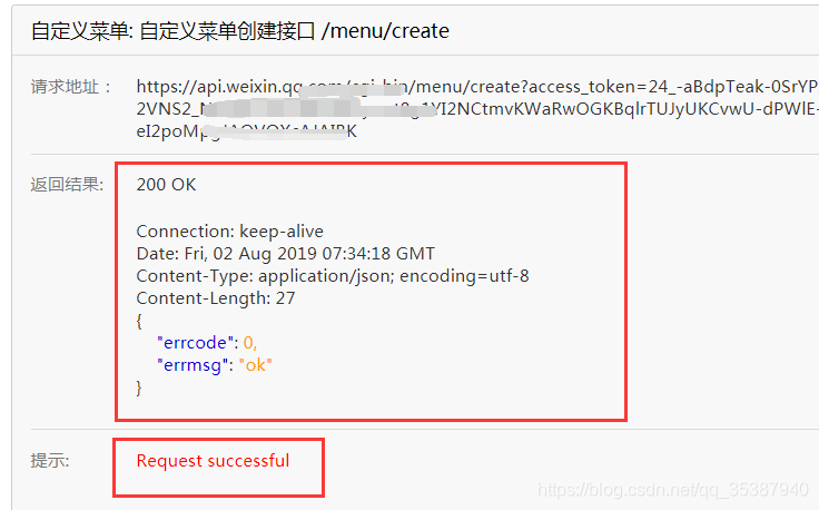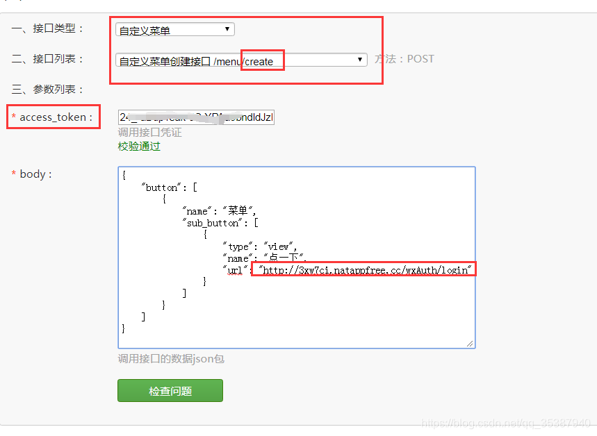 我们用在线接口调试工具,去在微信公众号测试号上面建一个菜单(当然那些用自己已有公众号的伙伴不需要这样,直接建个菜单,配置下链接就行)