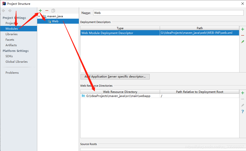 2、弹出的页面中选择Modules,这时右边会显示当前的项目名称,点击+号,选择web选项;