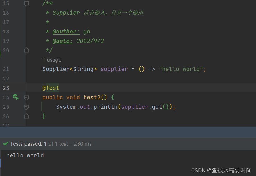 Supplier<String> supplier = () -> "hello world";