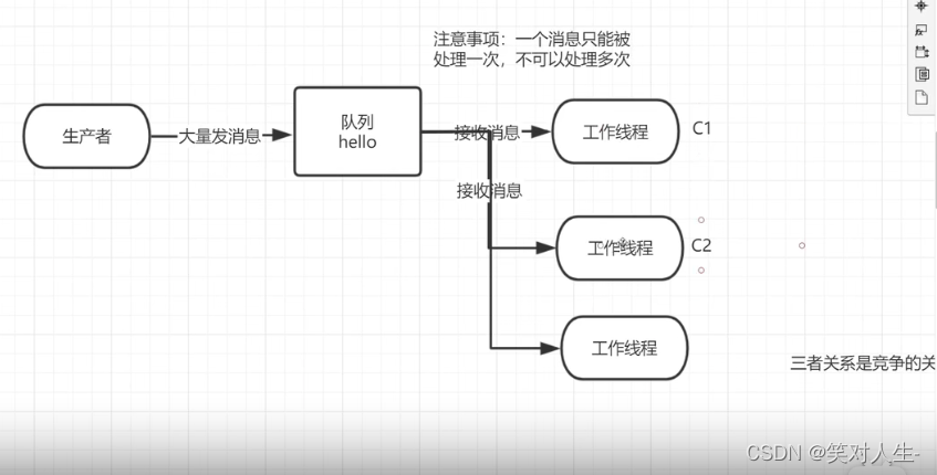 就是有多个消费者消费队列里的消息,队列里的消息只能被一个消费者消费,这样多部署几个消费者,就可以缓解压力,比如过年的时候抢票,抢票成功后会给你发短信,这个时候就可以把发短信的任务放入队列里,然后有多个发短信的服务来处理队列里的任务。