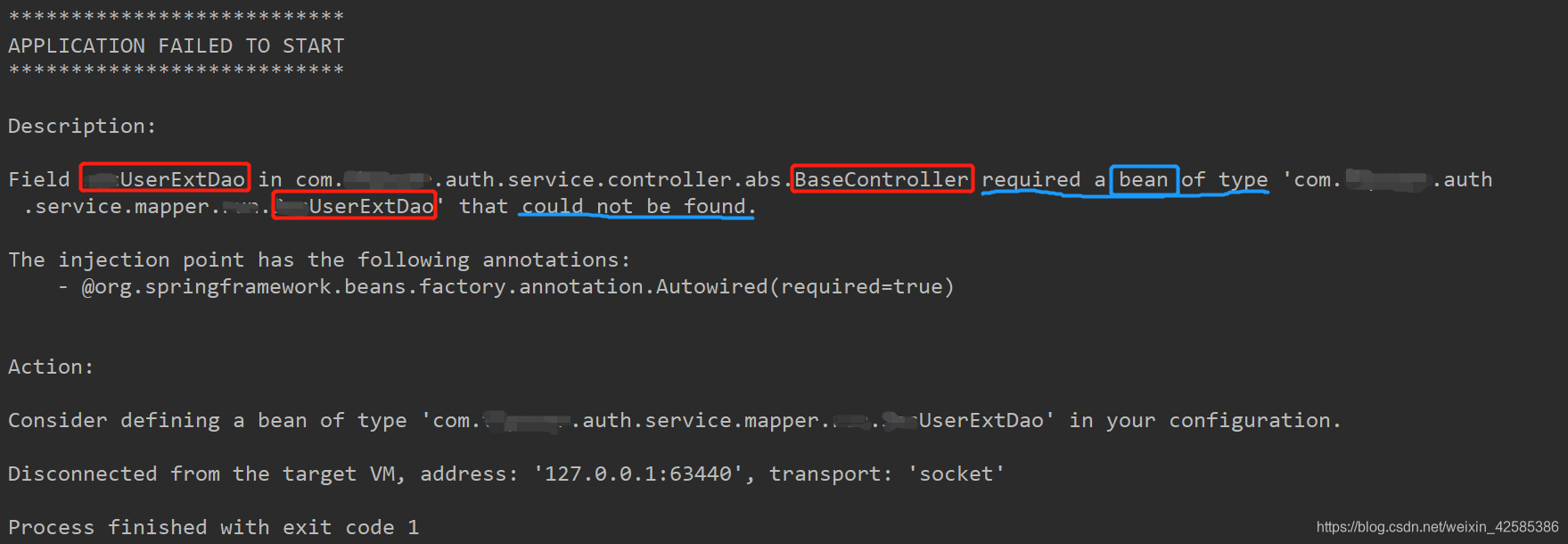 Field XxxUserExtDao in com.xxx.auth.service.controller.abs.BaseController required a bean of type ‘com.xxx.auth.service.mapper.run.XxxUserExtDao’ that could not be found.