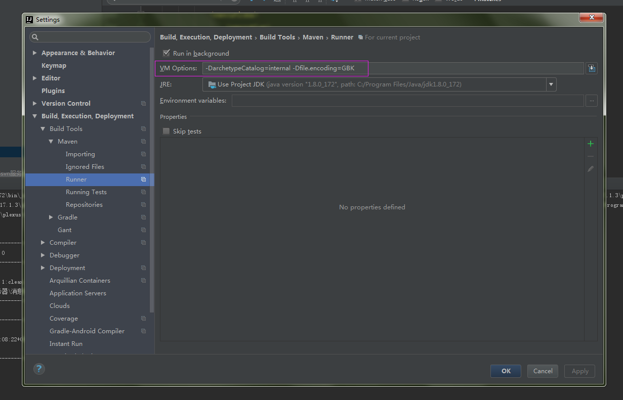 解决方法:file->Settings->Build,Execution,Deployment->Build Tools->Maven->Runer