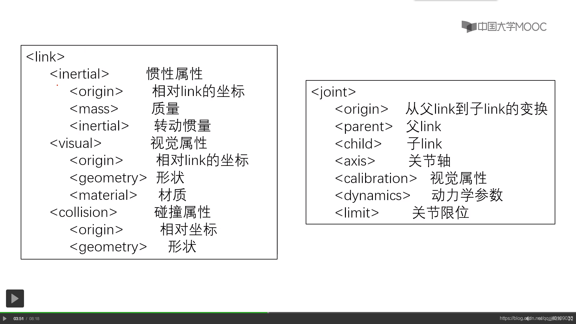 URDF( Unified Robot Description Format ) 统一机器人描述格式 (http://wiki.ros.org/urdf/XML)