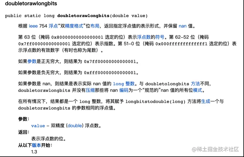问题就处在 doubleToRawLongBits 这个方法上,在 jdk 中 double 类(float 与 int 对应)中提供了 double 与 long 转换,doubleToRawLongBits 就是将 double 转换为 long,这个方法是原始方法(底层不是 java 实现,是 c++ 实现的)。