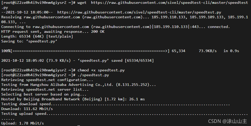 [root@iZ2ze0h4i9vi90nm4giysrZ ~]# chmod +x speedtest.py