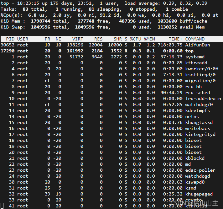 2. Swap: 表示硬盘上交换分区的使用情况,如剩余空间较小,需要留意当前系统内存使用情况及负载,当Swap的used值大于0时,则表示操作系统物理内存不够,已经开始使用硬盘内存了。