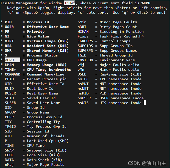 top命令中,按下 f 键,进入选择排序列的界面,这里可以选择要显示的信息列,要按照哪些信息列进行排序等。
