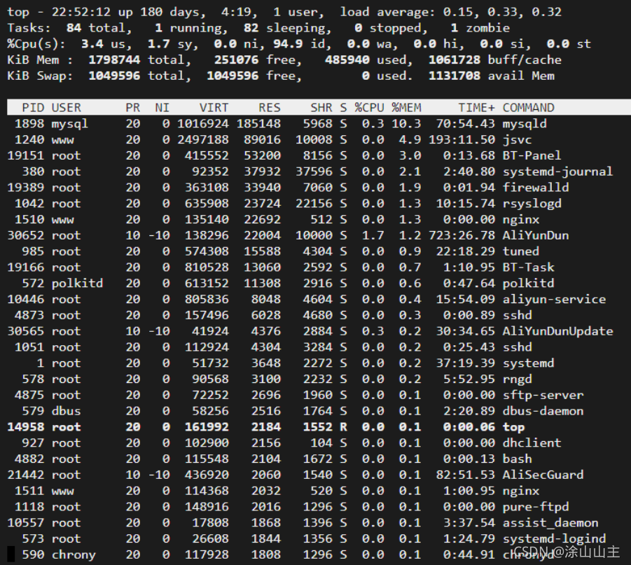 top 命令查看系统的实时负载, 包括进程、CPU负载、内存使用等等;
