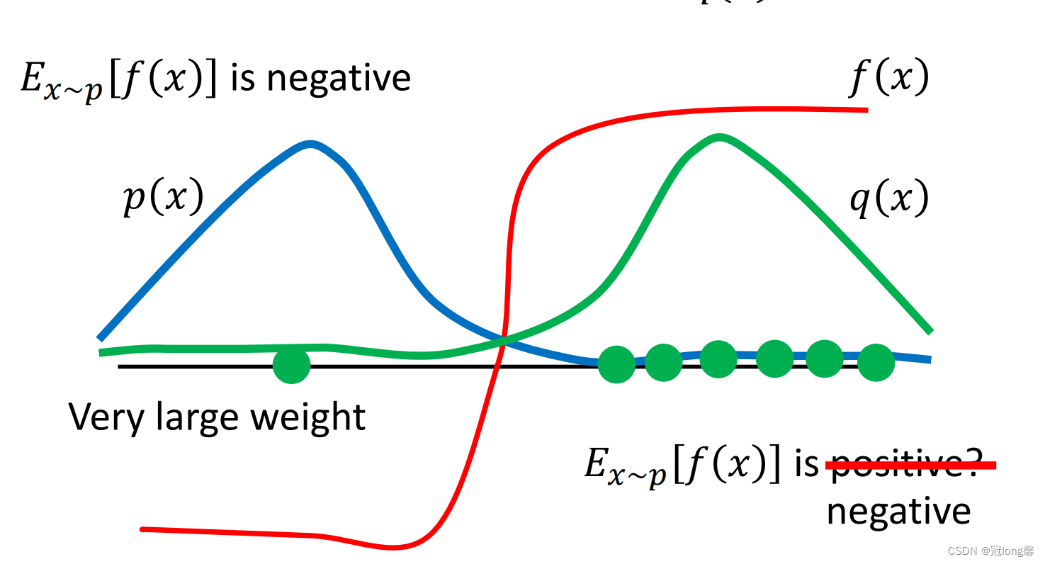 p(x),q(x)的差距不能太大,否则即使经过重要性采样转换后,所采集的数据的方差仍然具有较大差距。