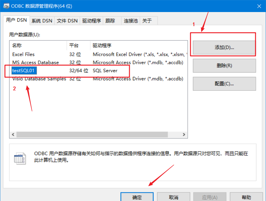 1) 打开 控制面板—〉管理工具—〉数据源,在用户DSN面板选择 “添加”