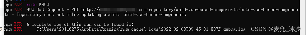 2.私服再次publish npm包时,报“E400, Repository does not allow updating assets”,错误如下图所示: