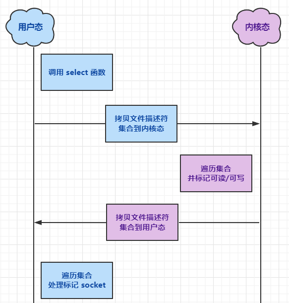 - select 函数将集合拷贝到内核(第一次拷贝)