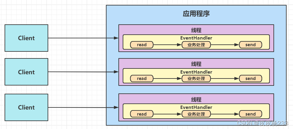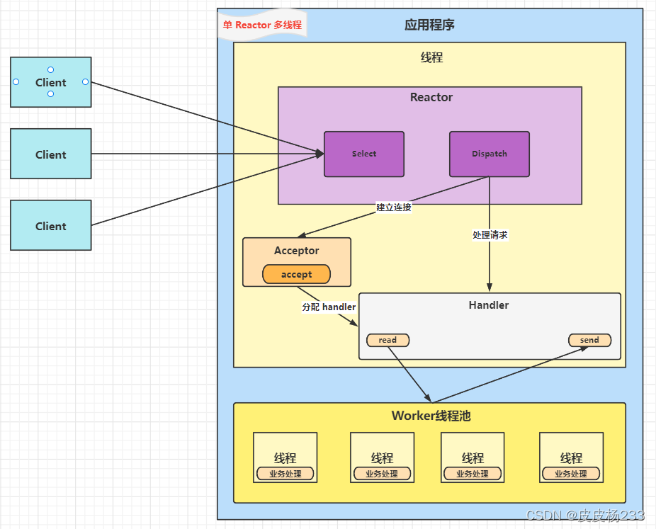 - 单 Reactor 单线程阻塞,是因为所有复杂耗时的业务都在一个线程中处理