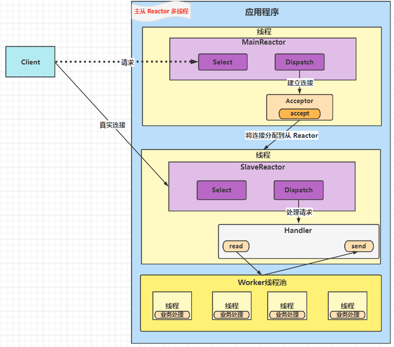 - 主从职责明确:主 Reactor 只负责接收新连接;从 Reactor 只负责处理业务