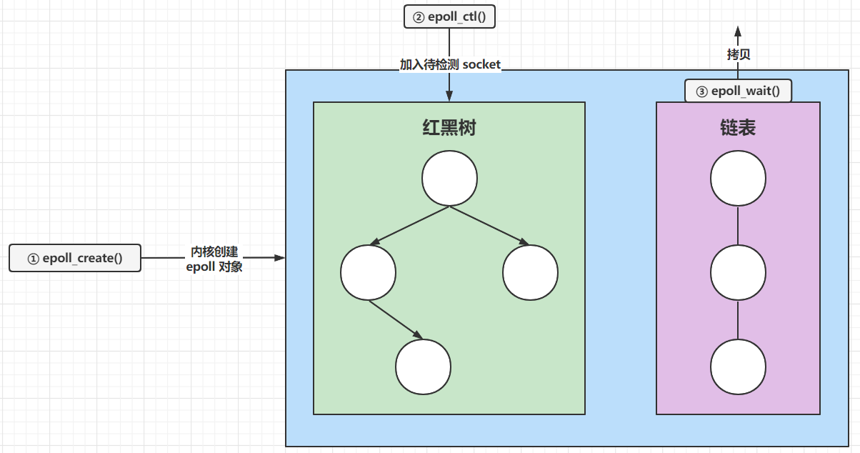 ① 内核中使用红黑树来跟踪待检测的文件描述符;每次只需要传入一个待检测的 socket,因为存储结构在内核中,不需要再从用户态中将整个集合拷贝;增删查均为 O(logn)