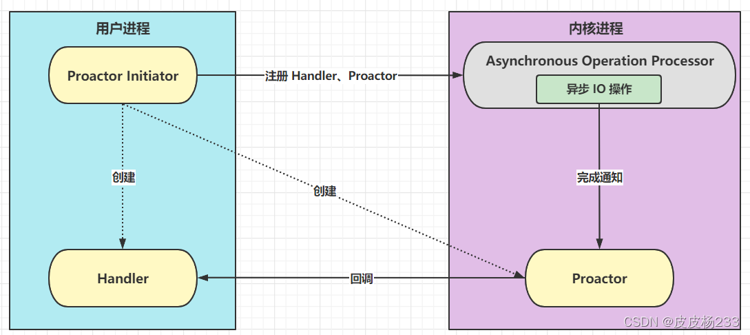 - Proactor Initiator 创建 Handler、Proactor,并通过 Asynchronous Operation Processor 注册到内核