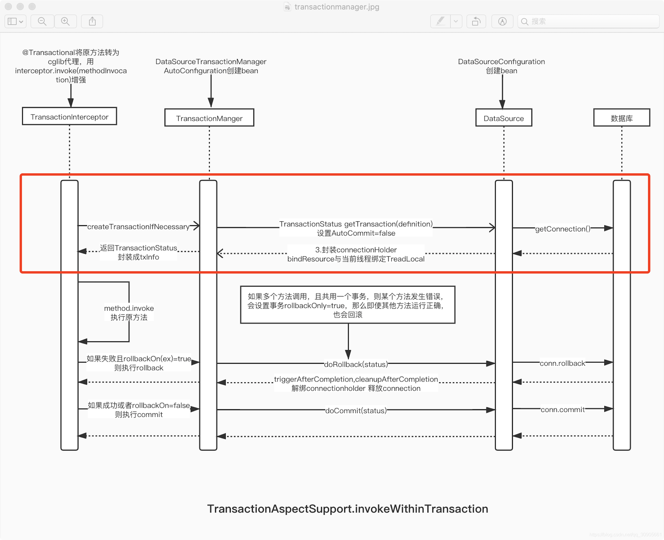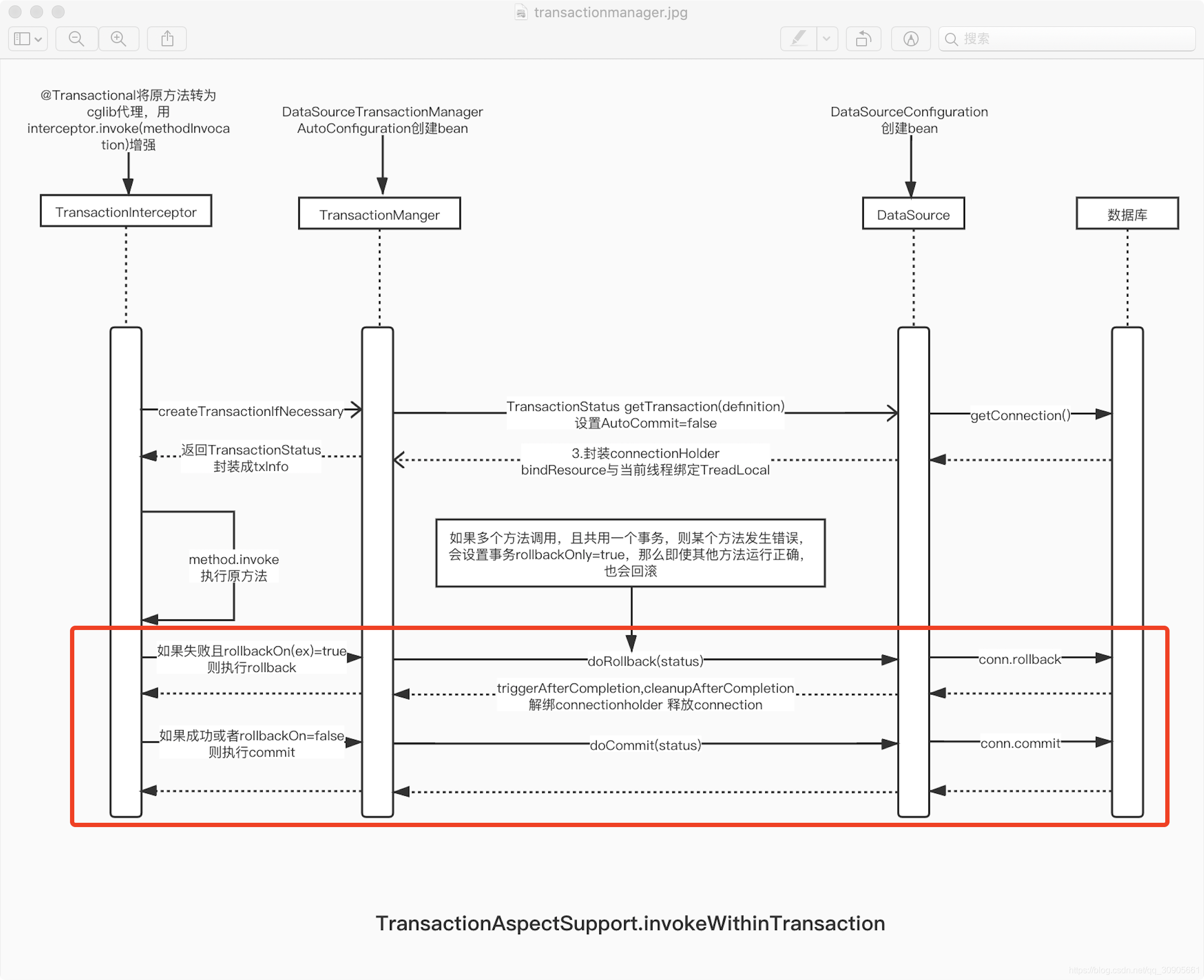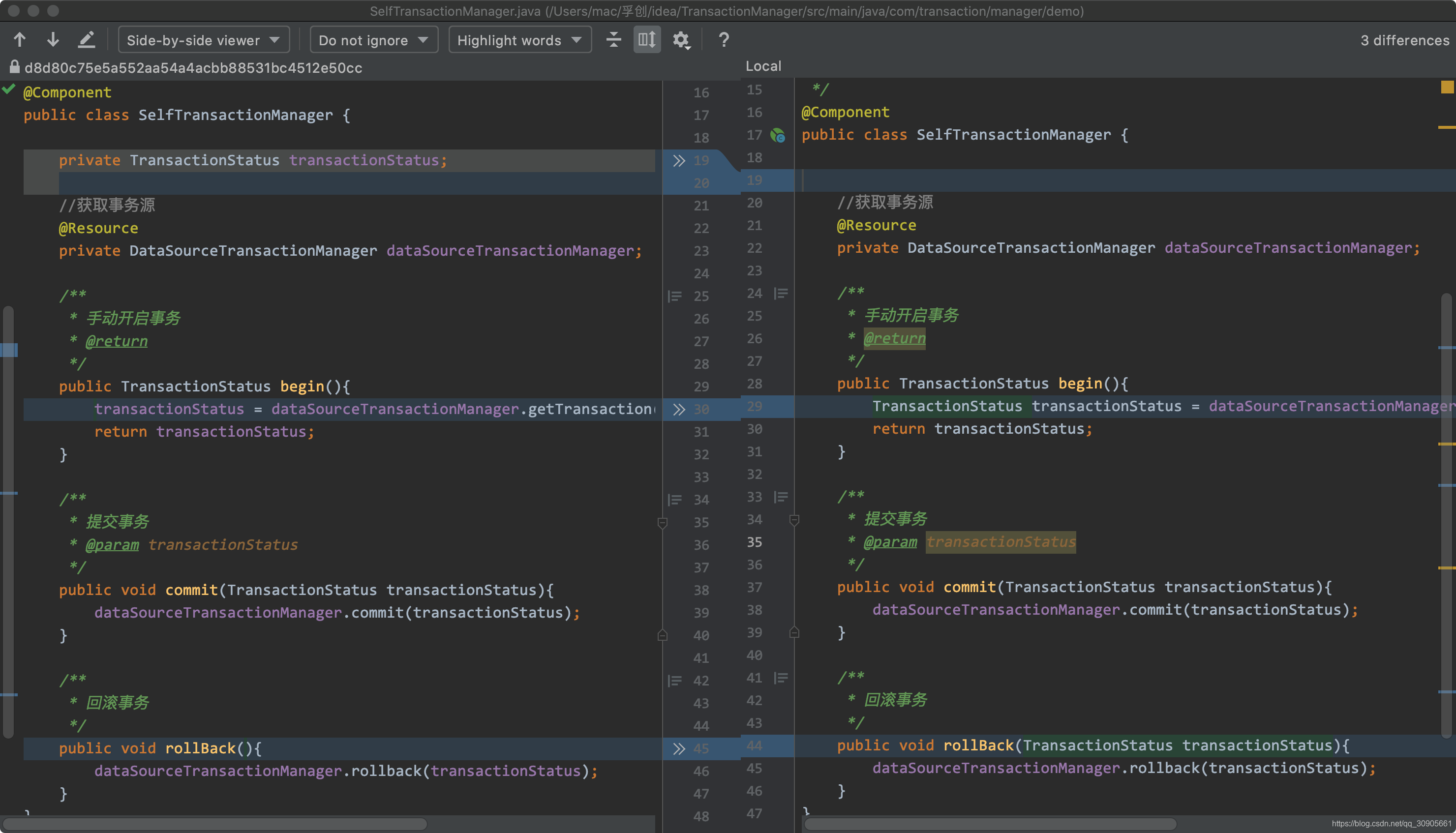 部分代码得修改下 rollback方法必须传入参数 transactionStatus ,如果用SelfTransactionMananger单实例中的属性transactionStatus,在多线程中会出现线程不安全的情况。
