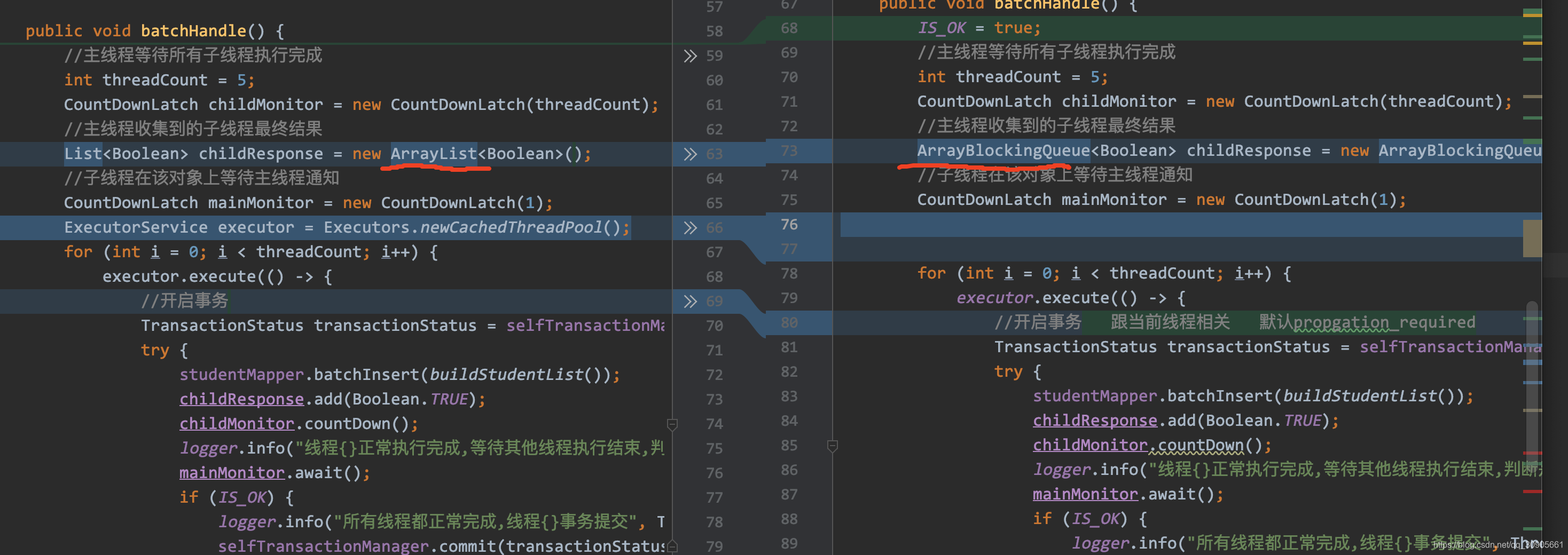 工作上有一个需求跟文章里的很像,要求任何一个线程发生错误后,所有主线程和子线程里的数据库操作全部回滚。文章中很聪明的用到了”二次确认”的思想,利用CountDownLatch确保所有线程都执行成功后,统一执行commit,如果有一个失败,则全部rollback。