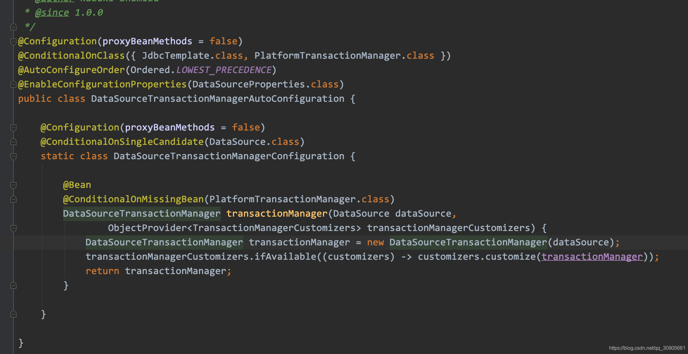 DataSourceTransactionManagerAutoConfiguration 创建TransactionManager manager = new DataSourceTransactionManager(dataSource);