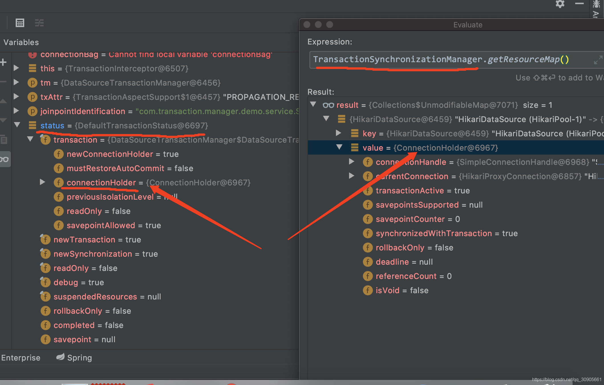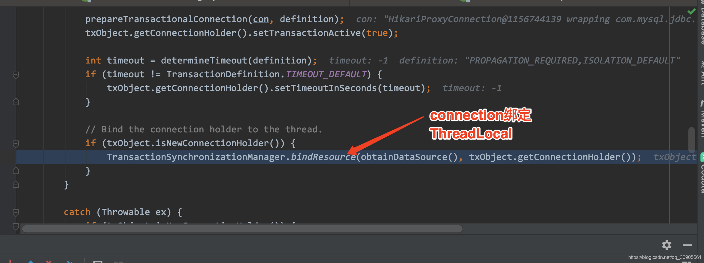 核心代码来了,TransactionSynchronizationManager.bindResource 将connectionHolder绑定到ThreadLocal,这样就将connection,TransactionStatus和当前线程绑定了起来