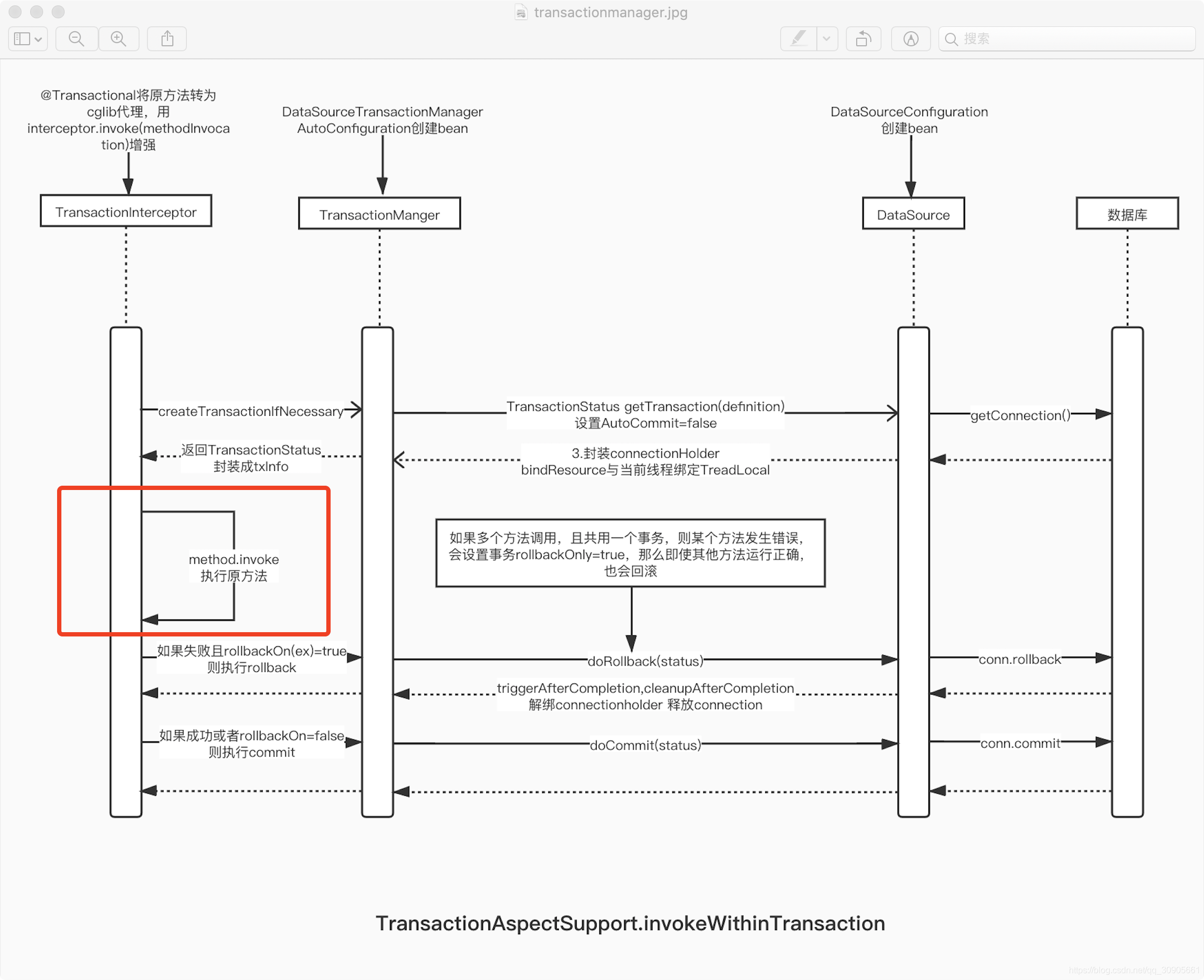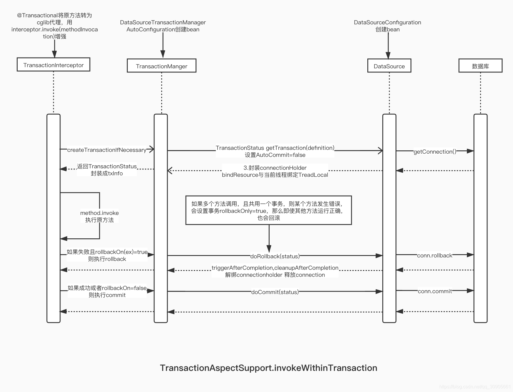 @Transactional spring会将该方法生成cglib代理MethodInvocation,由TransactionInterceptor(MethodInterceptor)执行interceptor.invoke(methodInvocation) 从而实现方法增强