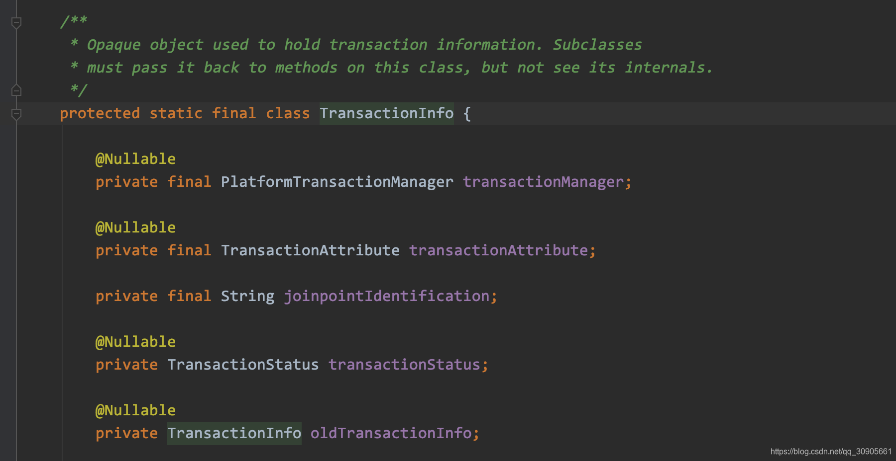 TransactionInfo 包含属性TransactionManager TransactionAttribute TransactionStatus