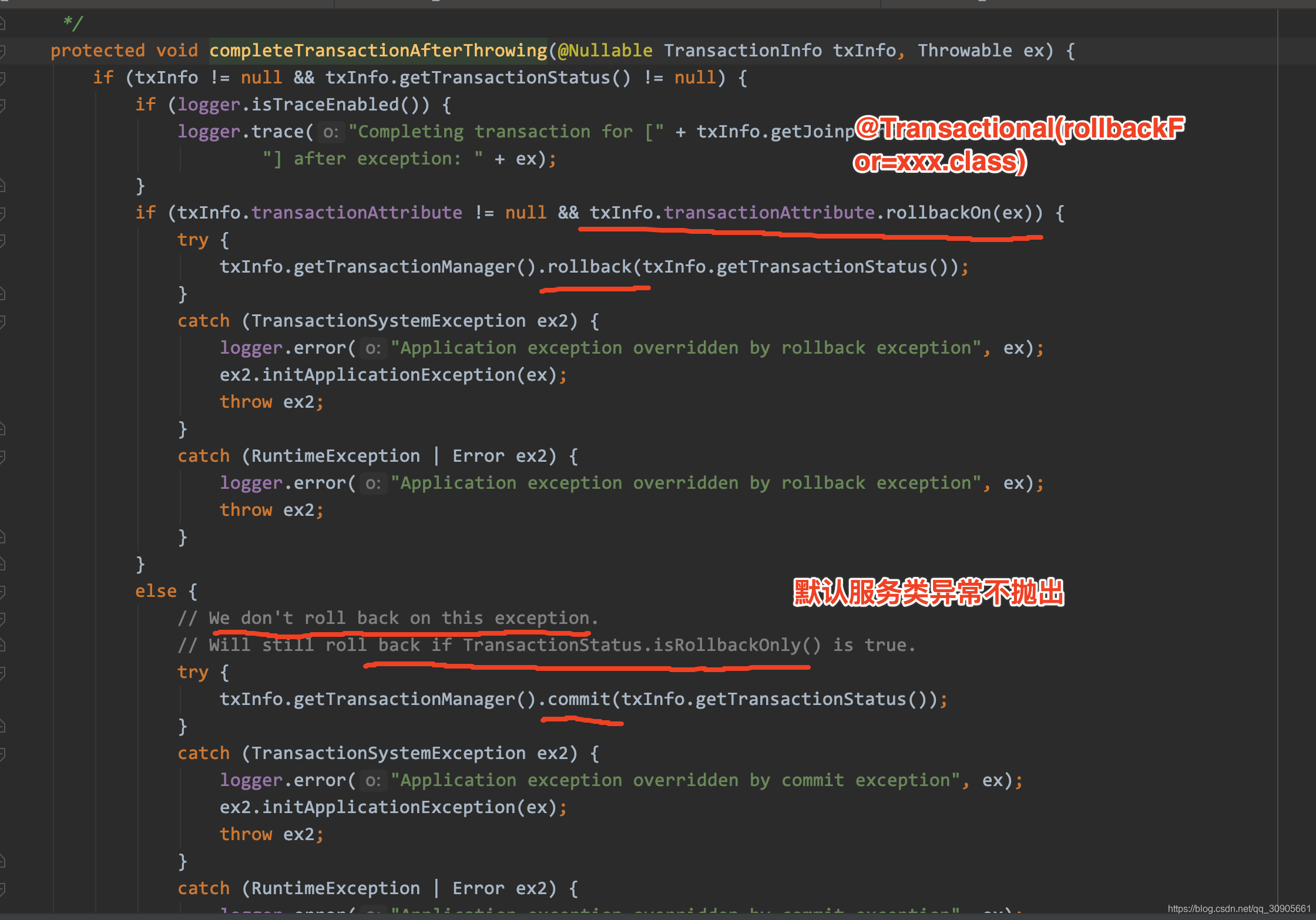 TransactionAspectSupport.completeTransactionAfterThrowing 如果抛了异常,则判断是否满足回滚条件