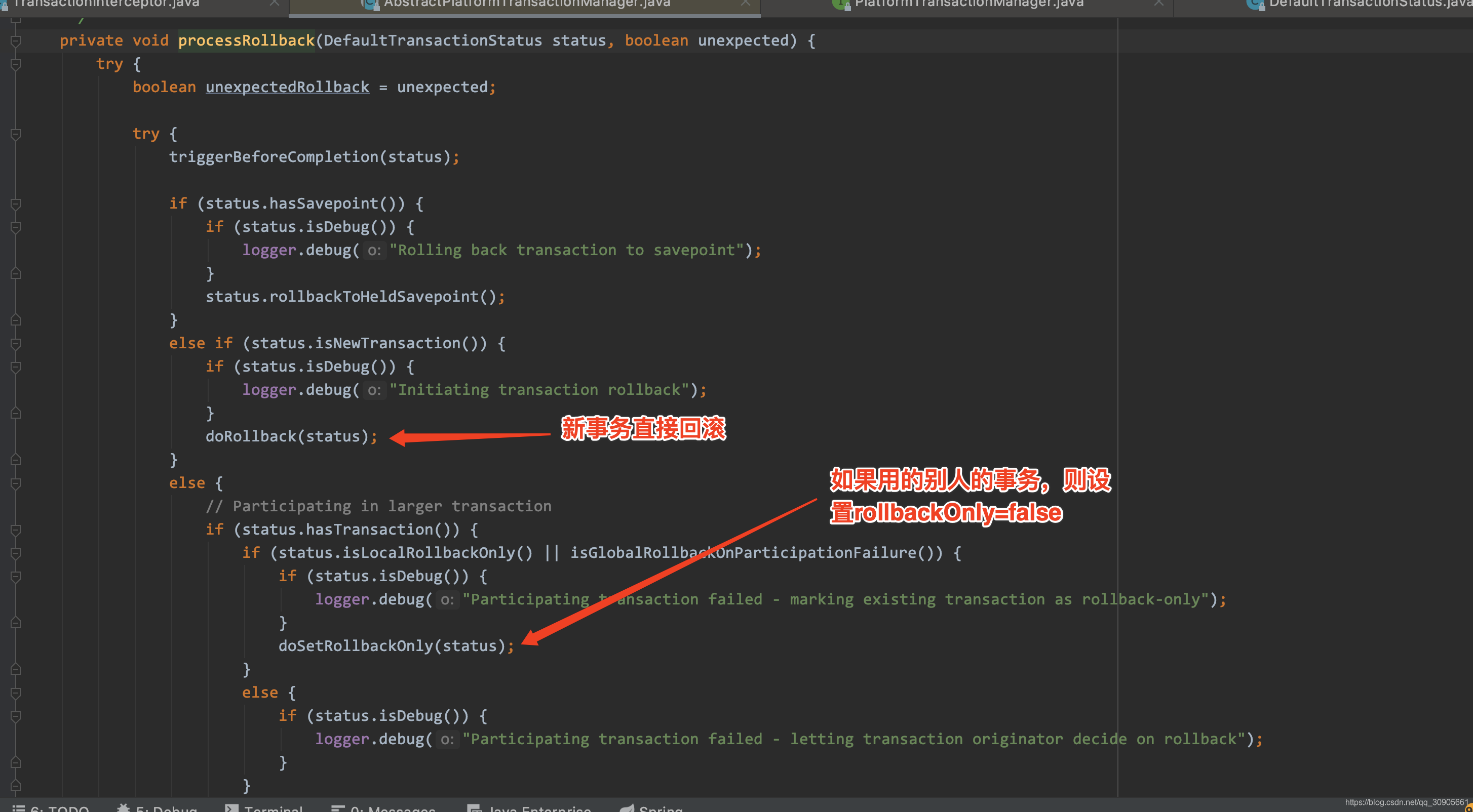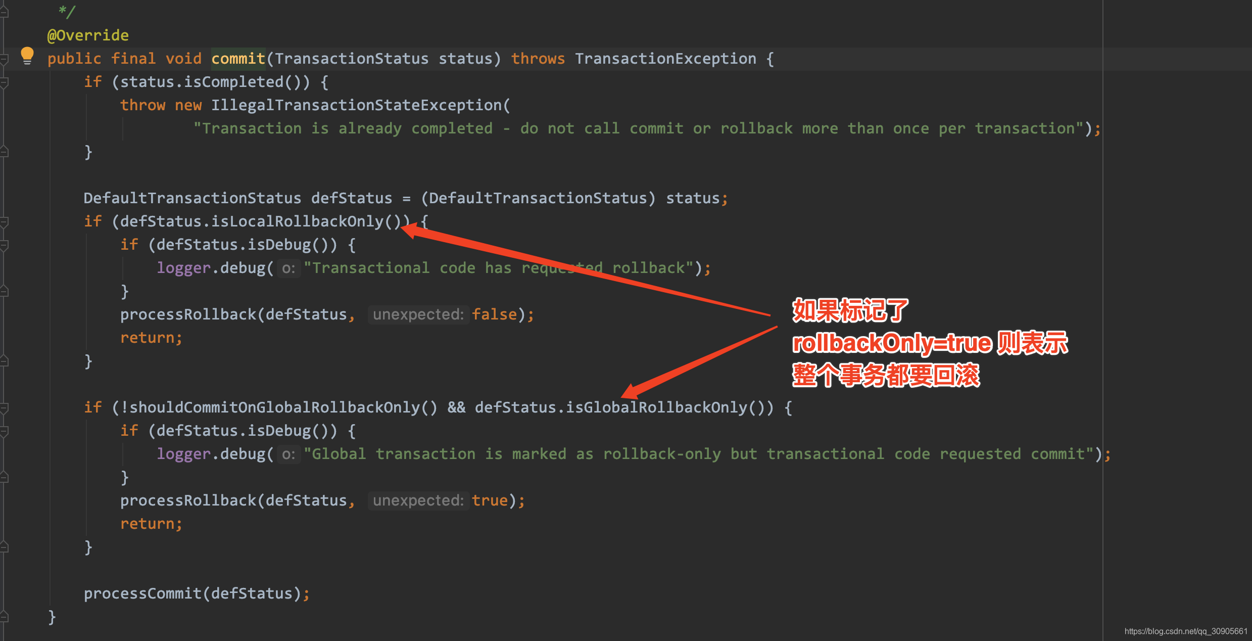 AbstractPlatformTransactionManager 执行提交操作 但还需要判断是否标记了rollbackOnly,有可能A,B两个方法共用同一个事务,B抛了异常,导致外层的方法A哪怕没错也得一起回滚。