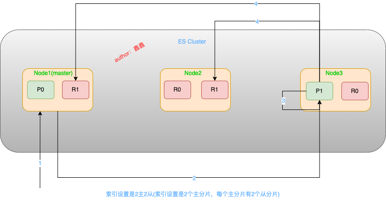 原集群:索引设置的是 3 主 1 从(索引设置的3个主分片,每个主分片一个从分片)。Node1 是 master 节点,P0、P1、P2 是主分片,R0、R1、R2 是从分片。