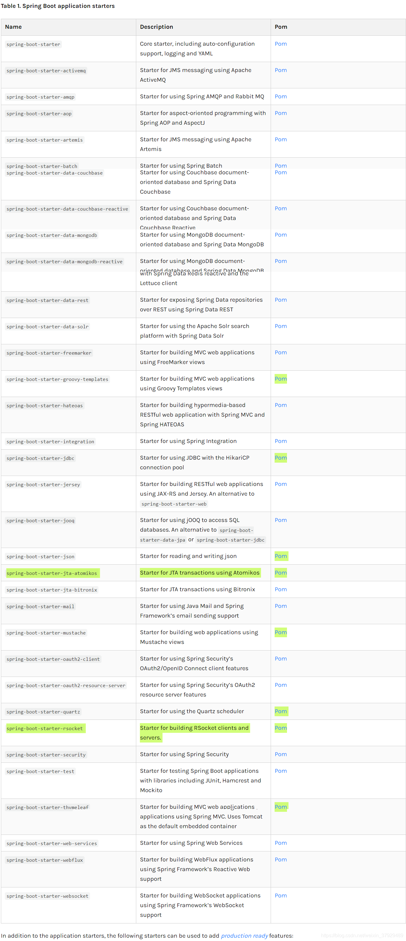springboot官方除了提供web依赖容器外,还提供了其他场景相关的starter,从官方文档中可以看到如下34种,根据版本不同,可能还会有对应的增减。