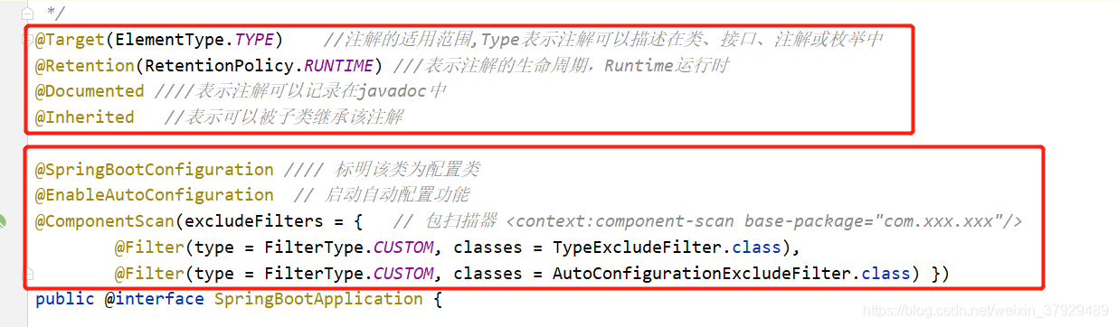 点进去发现@SpringBootApplication注解是一个组合注解,上边是注解的元数据信息,下边引入了其他注解: