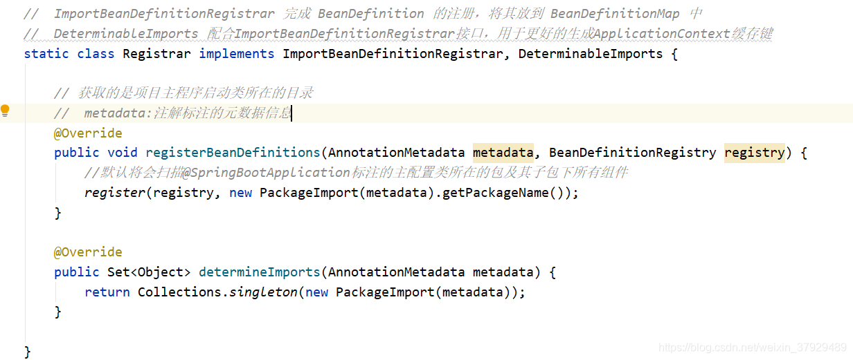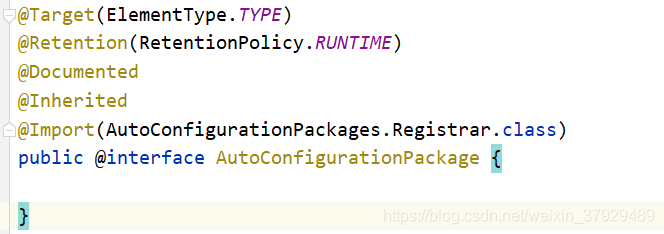 @AutoConfigurationPackage 注解,引入了一个 @Import 注解(spring框架的底层注解,它的作用就是给容器中导入某个组件类,此处就是将Registrar这个组件类导入到容器中)