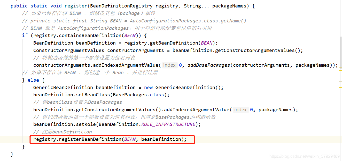 跟代码发现,@Import(AutoConfigurationPackages.Registrar.class) 实际上是将 org.springframework.boot.autoconfigure.AutoConfigurationPackages 注册到 beanDefinitionMap 中