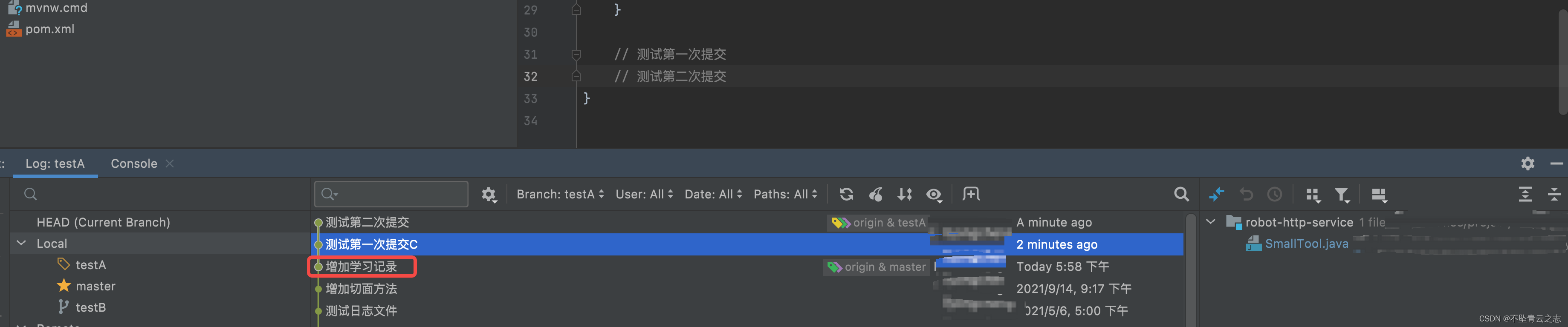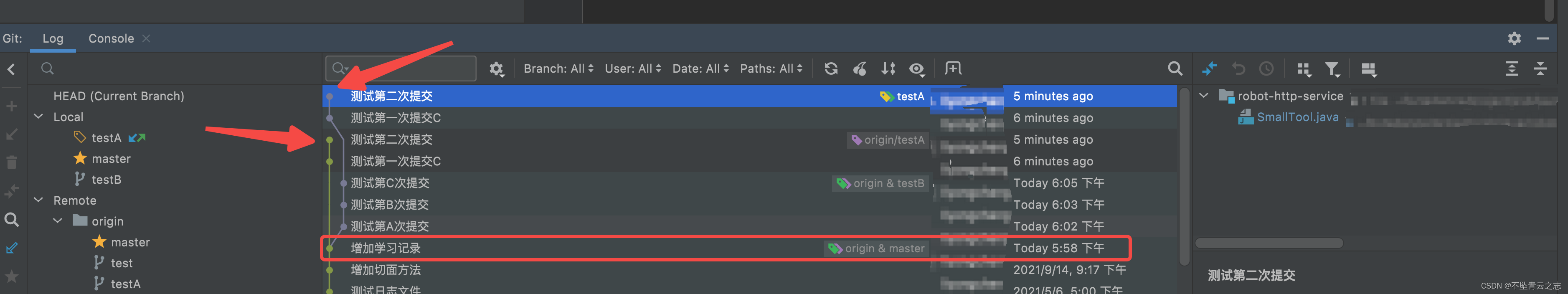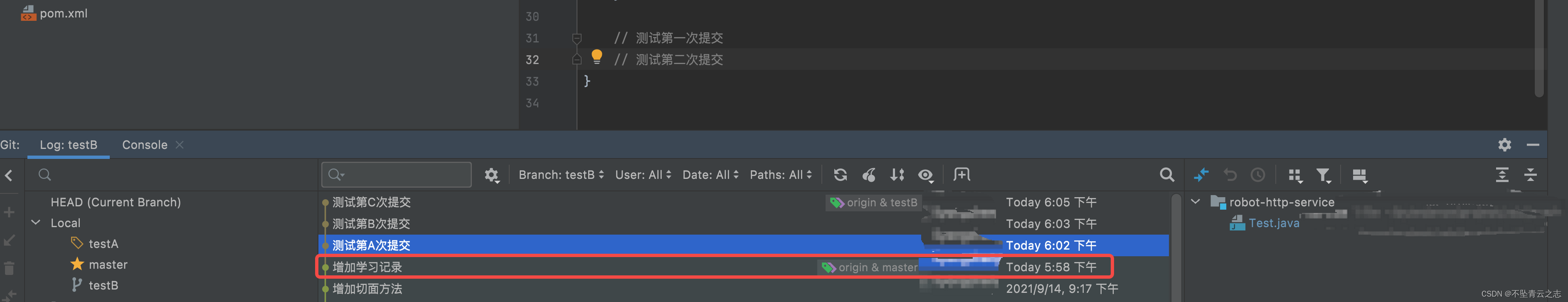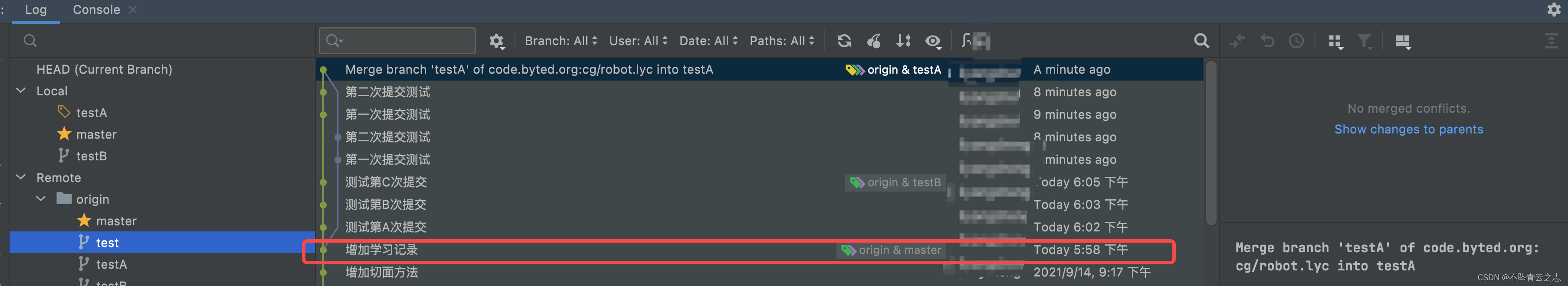 这样就把分支testB的提交记录提交到testA分支的提交记录前面了。