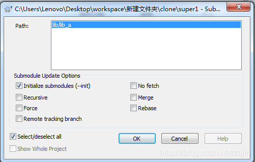 在需要作克隆子模组的Git工作区中右击,选择“TortoiseGit->Submodule Update…”,点击“OK”即可。