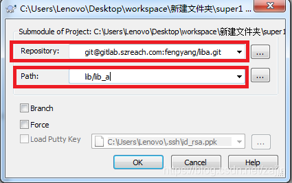 在需要作添加子模组的Git版本库中右击,选择“TortoiseGit->Submodule Add…”,在“Repository:”里面输入需要添加子模组的版本库路径,在“Path:”