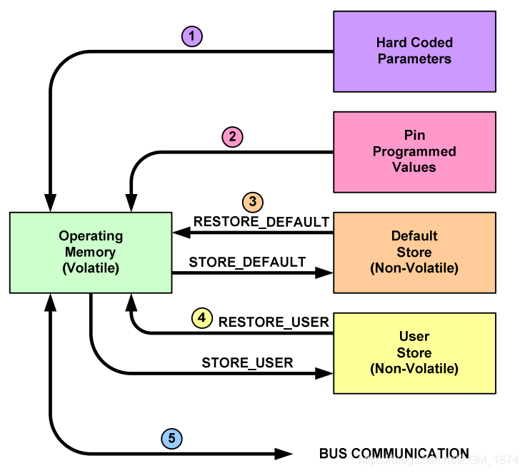 - 加载的第三组参数来自可选的非易失性默认存储(如果存在)。默认存储中的值通常由PMBus设备制造商编程。设备制造商可能允许或不允许用户覆盖默认存储中制造商提供的值。