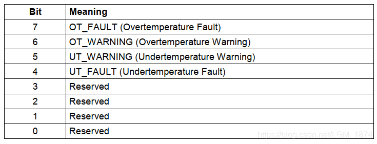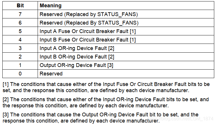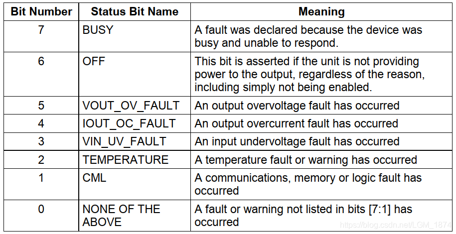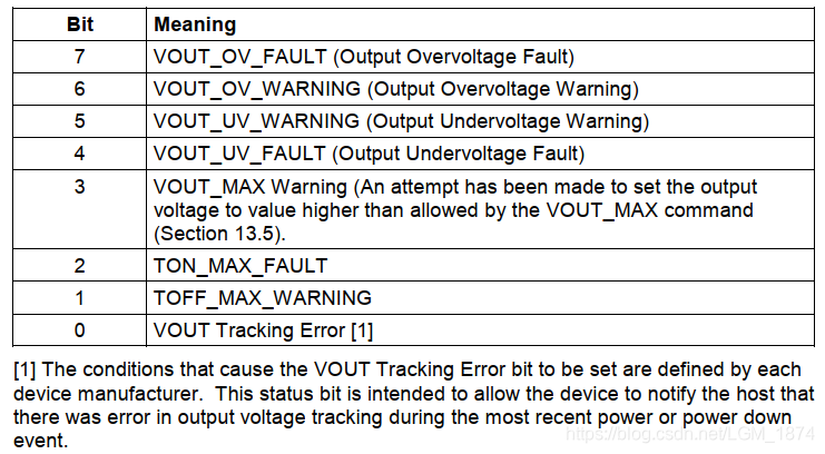 | 高字节 | 7 | VOUT | 发生一个输出电压故障或警告 |