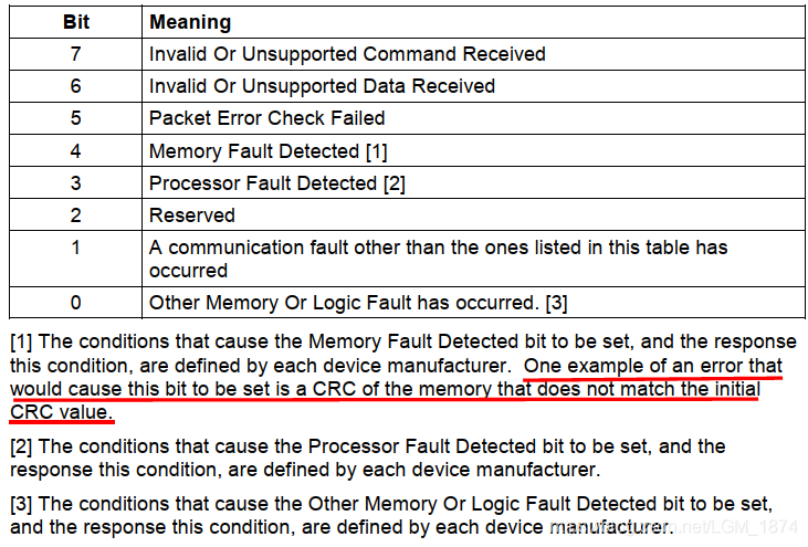 | 低字节 | 7 | BUSY | 因为设备忙碌或者无响应而声明一个故障 |