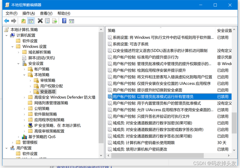 输入gpedit.msc后 根据如图 将用户账户控制:以管理员批准模式运行所有管理员设置为关闭状态