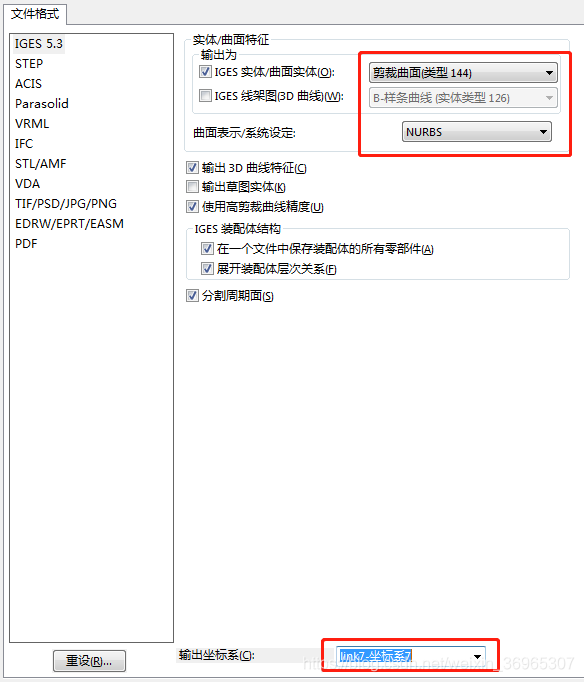 - Step2:在solidworks中将每个link保存成.IGES格式(注意单位设置成mm),具体保存选项如下图1所示,要特别注意输出坐标系的选择。