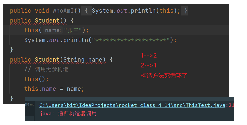 一下代码中,第一个无参构造方法调用了第二个有参构造,第二个有参构造又调用了第一个无参构造,会形成死循环。