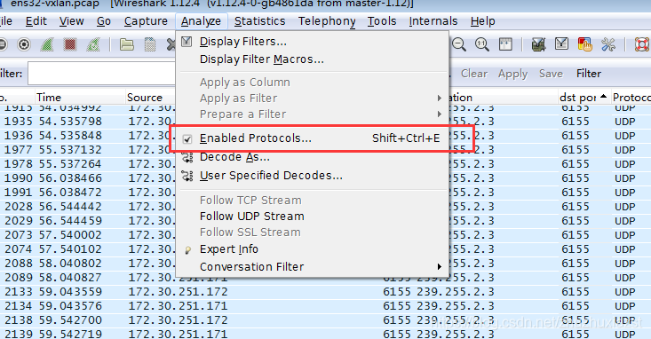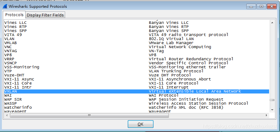 Internals -> Supported Protocols(slow!)->查看对话框中是否有vxlan协议,有的话说明此版本的wireshark已经支持解析vxlan协议,否则不支持,请更新wireshark版本.