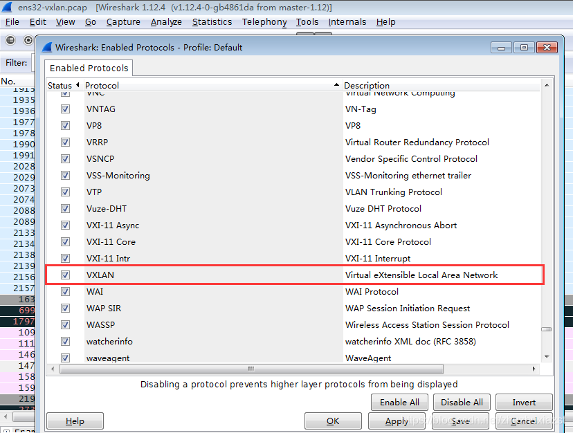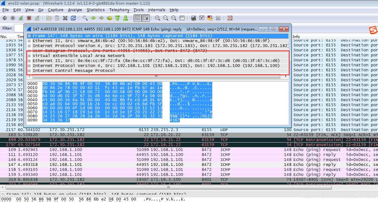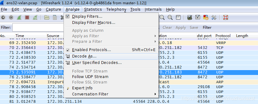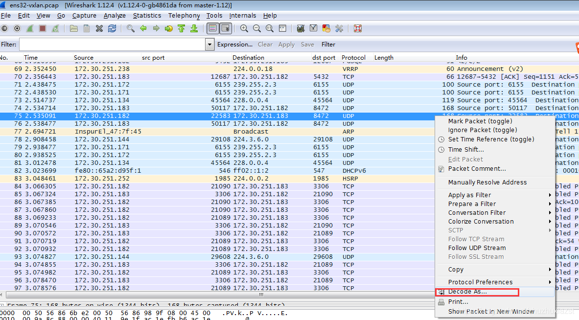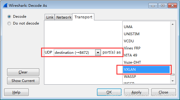 或者 选中 udp 端口8472 的数据包 -> (菜单栏) Analyze->Decode as -> UDP (destination 8472) decode as -> VXLAN