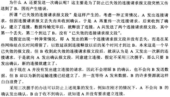“已失效的连接请求报文段”的产生在这样一种情况下:client发出的第一个连接请求报文段并没有丢失,而是在某个网络结点长时间的滞留了,以致延误到连接释放以后的某个时间才到达server。本来这是一个早已失效的报文段。但server收到此失效的连接请求报文段后,就误认为是client再次发出的一个新的连接请求。于是就向client发出确认报文段,同意建立连接。假设不采用“三次握手”,那么只要server发出确认,新的连接就建立了。由于现在client并没有发出建立连接的请求,因此不会理睬server的确认,也不会向server发送数据。但server却以为新的运输连接已经建立,并一直等待client发来数据。这样,server的很多资源就白白浪费掉了。采用“三次握手”的办法可以防止上述现象发生。例如刚才那种情况,client不会向server的确认发出确认。server由于收不到确认,就知道client并没有要求建立连接。”