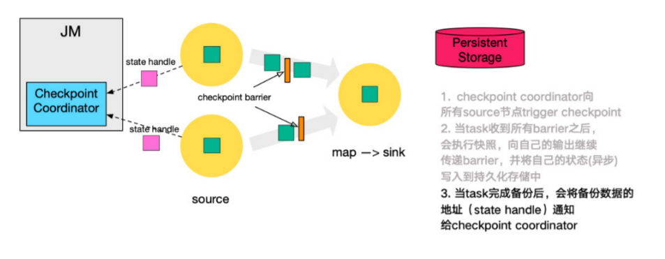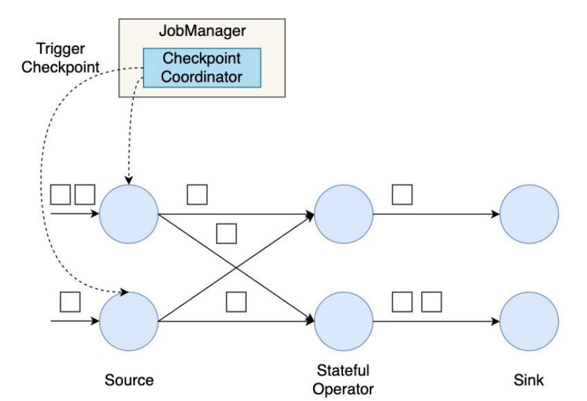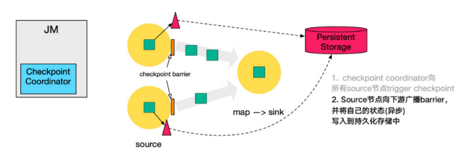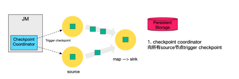 1. 第一步,JobManager中的Checkpoint Coordinator 向所有 source 节点 trigger Checkpoint(触发Checkpoint);