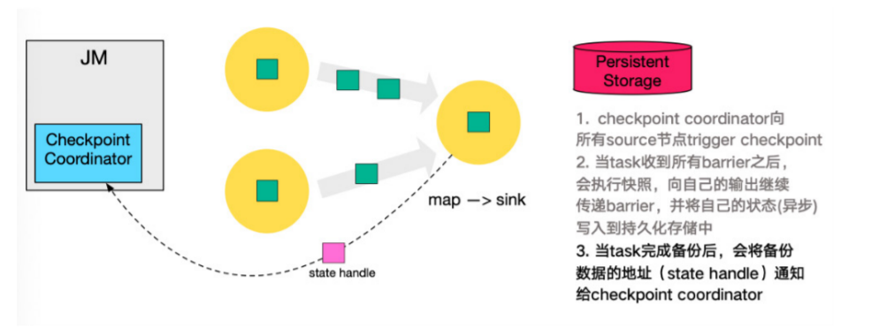 3. 第三步,当 task 完成 state 备份后,会将备份数据的地址(state handle)通知给 Checkpoint coordinator。