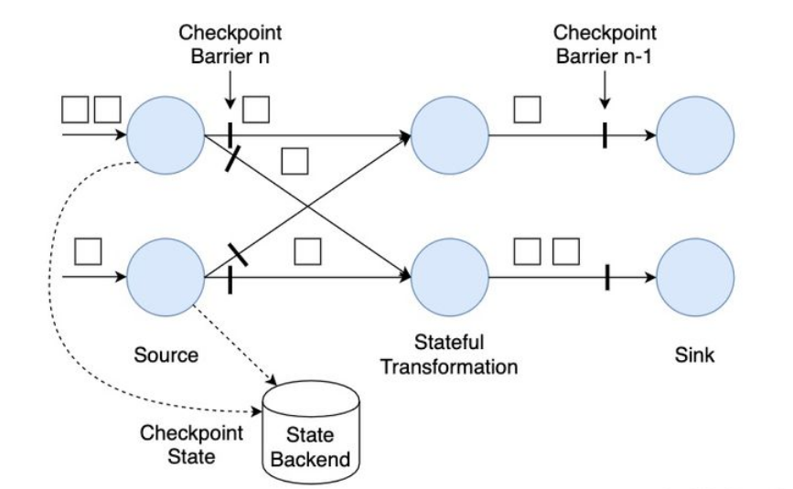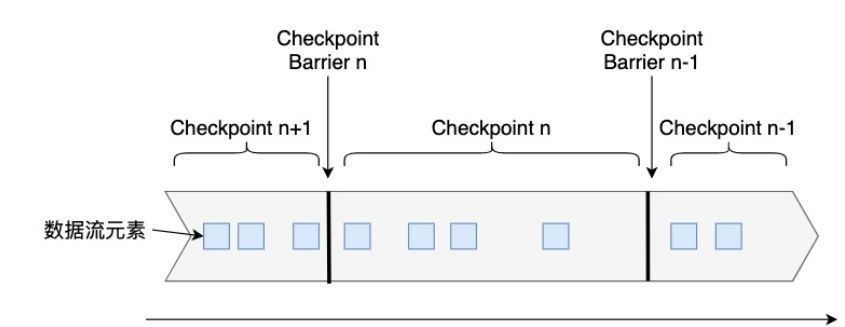 Flink是在Chandy–Lamport算法[1]的基础上实现的一种分布式快照算法。在介绍Flink的快照详细流程前,我们先要了解一下检查点分界线(Checkpoint Barrier)的概念。如下图所示,Checkpoint Barrier被插入到数据流中,它将数据流切分成段。Flink的Checkpoint逻辑是,一段新数据流入导致状态发生了变化,Flink的算子接收到Checpoint Barrier后,对状态进行快照。每个Checkpoint Barrier有一个ID,表示该段数据属于哪次Checkpoint。如图所示,当ID为n的Checkpoint Barrier到达每个算子后,表示要对n-1和n之间状态的更新做快照。Checkpoint Barrier有点像Event Time中的Watermark,它被插入到数据流中,但并不影响数据流原有的处理顺序。