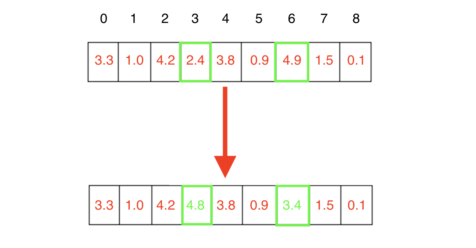 The most simple way we can do this is, given a certain mutation rate, to randomly choose some individuals and some genes and assign a new random number to those positions. This is exemplified in the diagram and code snippet below.